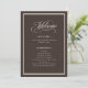 These elegant, simple wedding welcome programs feature an ivory cream border and a dark, espresso brown background. There is a mix of classic text and modern calligraphy for a classy and minimalist design perfect for your timeless, formal or rustic country western wedding.