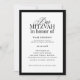 De här elegant-, svartvitt- och vita Pub Mitzvah-inbjudningarna har en dramatisk svart gräns och en svartvit textdesign. Det finns en blandning av klassisk svart text och modern kalligrafi för en klassisk, tidlös och minimalistisk design.