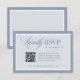 These elegant, luxe wedding RSVP response cards feature a dusty blue border, and a lighter blue and white text design. There is a mix of classic text and modern calligraphy for a classy and minimalist design perfect for your timeless, formal wedding. There is a scannable QR code so your guests can easily RSVP online at your wedding website.