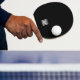 Classic monogram ping pong paddle. Monogram is classic text within a square border. Gray and white.