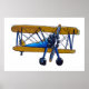 Captivate your imagination with this poster featuring a classic antique biplane, reminiscent of a Stearman, complete with its distinctive radial engines, vibrant yellow wings, and a sleek blue fuselage. The aircraft is depicted landed, highlighting its tricycle landing gear. This artwork captures the nostalgic charm of early aviation, perfect for enthusiasts, history buffs, or anyone seeking a touch of vintage elegance.