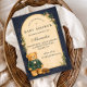 A charming preppy baby shower design featuring a sweet teddy bear dressed in a classic green plaid jacket and bow tie. Above the bear, a delicate clothesline displays tiny baby clothes and shoes, creating a nostalgic storybook nursery scene. The deep navy background and subtle tartan border add a refined, vintage-inspired touch that feels both elegant and playful. Perfect for a stylish baby shower celebration with a classic preppy aesthetic.
