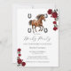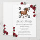 Embrace the timeless romance of the Kentucky Derby with this exquisite invitation that feels like a blooming garden masterpiece. Featuring a pristine white background, the design is framed by a lush, cascading wreath of deep velvety red roses and rich green foliage, creating a natural, organic border that exudes Southern charm. At the heart of the arrangement stands a majestic chestnut horse in mid-gallop, rendered with realistic detail and grace.