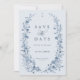 This elegant photo save the date card features soft dusty blue botanical florals arranged in a graceful wreath, paired with refined typography for a timeless winter aesthetic. The back showcases a personalized photograph, blending romantic storytelling with classic design. Inspired by vintage botanical artwork and cool icy tones, this sophisticated announcement is perfect for formal, traditional, and luxury winter weddings, offering a polished first glimpse of your celebration.