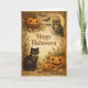 A warm, sepia-toned vintage Halloween illustration framed like an old storybook print. Cheerful jack-o’-lanterns nestle among wheat, corn stalks, and fallen leaves, while a wide-eyed owl perches beneath a crescent moon and bats glide softly through the dusk. A charming black cat, adorned with a pale bow, sits attentively in the foreground, adding a gentle, whimsical touch to the scene. The aged paper texture and traditional “Happy Halloween” lettering evoke early 20th-century postcards.