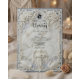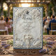 Set a tone of grand elegance for your estate wedding with this design featuring a faux bas-relief Baroque arch, musical angels, and a romantic blue palette.This design features a highly detailed, printed simulation of classical architectural carving. A central archway, rendered in the style of 3D white plaster, frames the text details against a faux dusty blue background. The artwork includes intricate bas-relief effects of blooming white roses, acanthus scrollwork, and two swans at the base. At the top of the column, a cherub angel playing a violin adds a touch of movement. The typography blends an ornate calligraphy script with a traditional serif font in dark charcoal grey for readability.This is a flat printed image with a faux stone texture effect, not actual raised material or embossed paper.