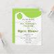En inbjudan med ett grönt- och White färg-schema. Framsidan har gröntens utformning överst och illustration av gröntens äpple överst lämnat. Virvel bakgrund. Anpassa med lärarens namn, klass, plats och datum för din back to school öppna bostadsinriktning. Motsatt sida är en solid grönt.