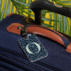 Klassisk bagagetagg med monogrammet med ditt första monogram i grönt på blommigtens gult mönster. Lägg till kontaktinformationen på baksidan.