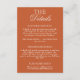 Simple and stylish retro wedding guest info details. With burnt orange background and white text layout with whimsical old money classy wordings. All the info are customizable as website, transportation, accommodation . Grab it along with other products from this classy hand made retro wedding suite.