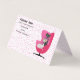 This fold over standing business card is white with vibrant pink polka dots and two class cats, white with yellow eyes and black with green eyes sitting in a mid century style pink chair. Customise all your information on the front, back, and inside with the templates.