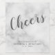 Klassy Elegant White Marble Bröllop Vin Lable med titeln "Cheers" i det moderna typsnittet grått med namn och datum i modernt sans serif-typsnitt på vit marmorbakgrund.