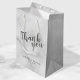 Klassy Elegant White Marble Wedding Favor Gift-påse med titeln "Tack för dig" i gråttets moderna skript med namn och datum i modernt sansserif-teckensnitt på vit marmorbakgrund.