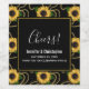Bröllop flaska-märkning med elegant och snyggt mönster. Söt gult solblommor och grönt löv omges av känsliga guld-kedjor. Svart bakgrund. En svart ruta med faux guld-folie gräns överst med personlig inuti.