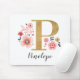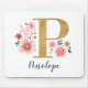 Ett vackert, femininin monogrammat musknapp för rosa blommigt, med rosa blommor och faux guld monogram brev P. Anpassa musmattan genom att lägga till ditt namn under monogrammet. Gör en roligt till en vän eller till en brud gåva. Designad av Blackberry Boulevard.