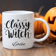 Modern Halloween-kaffets mugg-design har "Classy Witch"-text i svart typografi. Anpassade kaffe mugg i anpassningsbar har en modern dekorativ svart typografi med stjärnaccenter. Gör anpassningsbarna till perfekten för henne - din vän, flickvän, syster eller till och med din granne. Perfekt för att få dem att känna sig speciella, öka deras förtroende och få en unik och löjeväckande gåva!