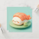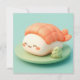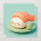 This heart-melting design features an incredibly adorable shrimp nigiri sushi character with a sweet, joyful face and soft rosy cheeks. Rendered in a high-quality 3D clay style, the character has a smooth, matte white rice body topped with a textured orange shrimp tail that shows realistic segment details. The sushi character sits comfortably on a minimalist light green circular plate, accompanied by a small, textured mound of bright green wasabi. Set against a clean, solid teal background, the overall "kawaii" aesthetic is modern, bright, and full of gentle charm, making it an irresistible choice for any fan of Japanese cuisine or whimsical food-themed art. This cheerful sushi postcard is a wonderful choice for sending a "soy happy for you" note or a playful greeting to a friend who loves foodie adventures. You might choose to use this cute food card for a Japanese dinner party invitation or to celebrate a fun culinary milestone with your family members. It also makes a precious decorative piece for a kitchen wall or a bright addition to a food-themed scrapbook as a small token of happiness. This versatile design is also an excellent choice for restaurant grand opening announcements, sushi-making class invites, or as a heartwarming way to share a short message of joy for any situation or event.