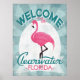 Clearwater Florida rosa flamingo. I vintage resor poster stil, står det "Välkommen till Clearwater, Florida" i turkos av rosa, vit och mynt grönt.