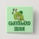 Detta Sts Patrick dagdesignen presenterar en gullig tecknadshamrock som ha på sig en gröna derby och vinkar en irländsk flagga och förse med text "den Cleveland irländare" i stor grön text.