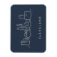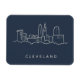 En skiss över Cleveland Skyline på blå bakgrund med text nedanför