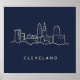 En skiss över Cleveland Skyline på blå bakgrund med text nedanför