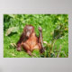 Orangutan baby klättrar på en buske. Morsa var precis under och tittade på den lilla.