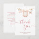 Send your thanks in style with these sweet and modern baby shower thank you cards. The design features a soft watercolor clothesline with baby girl items like a pink romper, socks, and a plush bunny, hanging gently from a rope with eucalyptus leaves. The soft pastel colors and clean layout add a modern, feminine touch. Perfect for matching a baby girl clothesline shower theme.