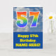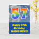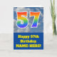 På framsidan av den här roligtens 57:e födelsekortdesign finns en grumlig bild av blå himmel, tillsammans med siffran "57" med ett flerfärgat regnbågsspektrum som gradienten mönster. På framsidan finns också ett meddelande om födelsedagen hälsning, inklusive en personlig som tar emot namn. Insidan innehåller ett anpassat hälsning-födelsedagsmeddelande eller kan kanske tas bort och lämnas tomt om ett meddelande ska skrivas för hand i stället. Ett sådant här födelsedagskort i personligen kan vara ett roligt för att erkänna någons femtiosjunde födelsedag. [~Z0000370]