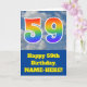 Framsidan av den här roligtens 59:e födelsekortdesign har en representation av ett grumligt blå himmel, tillsammans med siffran "59" med ett flerfärgat regnbågsspektrum som gradientutseende. På fronten finns också ett meddelande om födelsedagen hälsning, inklusive en redigerbar mottagare namn. Insidan innehåller ett hälsning-meddelande från anpassadets födelsedag, eller kan kanske tas bort och lämnas tomt om ett meddelande ska skrivas för hand i stället. Ett födelsedagskort som detta kan vara ett sätt att skicka önskemål på födelsedagen till någon som firar sin femtionionde födelsedag på roligten. [~Z0000370]