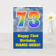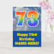 Framsidan av denna 73:e födelsedag-kortsdesign på roligten har en grumlig bild av blå himmel, tillsammans med siffran "73" med ett flerfärgat regnbågsspektrum som gradienten mönster. På fronten finns också ett meddelande om födelsedagen hälsning, inklusive en redigerbar mottagare namn. Insidan innehåller ett hälsning-meddelande från anpassningsbarnas födelsedag, eller kan kanske tas bort och lämnas tomt om ett meddelande ska skrivas för hand i stället. Ett sådant här födelsedagskort i personligen kan vara ett roligt för att erkänna någons sjuttiotredje födelsedag. [~Z0000370]
