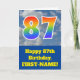 Framsidan av den här roligtens 87:e födelsekortdesign har en representation av ett blå himmel med moln, tillsammans med siffran "87" med ett flerfärgat regnbågsspektrum som gradientutseende. På fronten finns också ett meddelande om födelsedagen hälsning, inklusive en redigerbar mottagare namn. Insidan innehåller ett hälsning-meddelande från anpassningsbarnas födelsedag, eller kan kanske tas bort och lämnas tomt om ett meddelande ska skrivas för hand i stället. Ett sådant här födelsedagskort i anpassadet kan vara ett roligt sätt att skicka önskemål till någon som firar sin åttiosjunde födelsedag. [~Z0000370]