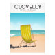 Clovelly, devon vintage resor poster konstverk med en vacker, gammal däcksstol på sandstranden.