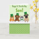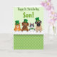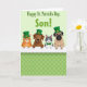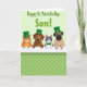 Designad med fyra söta tecknade djur som tittar över en ljus vit avsats, känns denna scen för St. Patrick's Day vänlig och lite tillgiven, som om de lutar sig in för att hälsa någon särskild. Från vänster till höger finns en orange tabbykatt med gröna ögon, en brun hund med stora, milda ögon, en grå-vit katt med blå ögon och en liten grön fluga, och en hjorthjortfärgad hund med skrynkligt ansikte och en uppriktig blick. Tre av dem bär höga smaragdgröna topphattar med guldbuketter, vilket lägger till en festlig touch som passar bra med det mjuka gröna temat 💚. Bakgrunden är en blek mintgrön med ett upprepande mönster av små treklöver ☘️, vilket ger scenen en lätt, luftig känsla. Nära toppen står budskapet "Happy St. Patrick's Day, Son!" i stora gröna bokstäver, centrerat ovanför djuren. Deras ansikten är vända rakt mot betraktaren
