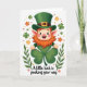 This card features a cheerful leprechaun-like character on a bright white background, smiling wide with rosy cheeks and a curly orange beard that frames his round face. He wears a green top hat with a shiny gold buckle, and his green outfit looks smooth under soft, even lighting. His hands cradle an oversized four-leaf clover 💚, held close like a small gift meant for someone special. Around him, smaller clovers ☘️ and tiny flowers in orange, pink, and pale yellow float like confetti, adding a gentle springtime feel. Low on the design, leafy green branches curve in from the sides and help frame the character without crowding him. The phrase “A little luck is peeking your way” sits beneath the illustration in green lettering, centered and easy to spot against the white space. The clover in his hands is shaded in deeper and lighter greens, and the gold buckle catches the light with a small gleam.
