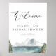 Denna välkomstskylt till bröllopsfesten har en akvarellmålning av en bergssjöscen med tallar och ett elegant skrivstil. Ändra enkelt *mestadels* texten så att den passar dina evenemangbehov.