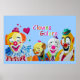 Clowns Galore Poster. Denna poster är dekorerad med en vattenfärgsmålning av fyra cirkusclowns och ord ’Clowns Galore’.