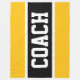 Strong bold letters inside a wide black horizontal center stripe with bold COACH text highlighted with white pinstripes against bright yellow orange outer stripes. The text can be personalized.