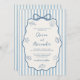 This dusty blue and ivory whimsical coastal wedding invitation features a coquette scalloped frame with a bow on a background of watercolor stripes, hand drawn beach seashell doodles, and handwriting script.