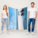 A peaceful coastal scene featuring a lone blue boat resting along the shoreline under soft ocean light. The minimalist composition and calming tones make this piece ideal for modern coastal interiors, beach house decor, or any space seeking a relaxed, ocean-inspired atmosphere.