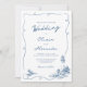 This whimsical hand drawn white and navy blue nautical wedding invitation features a squiggly frame with a lighthouse in the lower right corner.