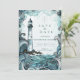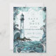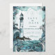 This coastal wedding design features a hand-illustrated lighthouse rising above dramatic ocean waves, framed by flowing watercolor textures in soft teal, seafoam, and deep blue tones. The composition blends nautical romance with an elegant, storybook feel, creating a striking yet refined seaside aesthetic.