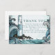 This coastal wedding design features a hand-illustrated lighthouse rising above dramatic ocean waves, framed by flowing watercolor textures in soft teal, seafoam, and deep blue tones. The composition blends nautical romance with an elegant, storybook feel, creating a striking yet refined seaside aesthetic.