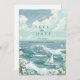 This coastal wedding design features a serene ocean scene with rolling teal waves, a graceful sailboat, and an open sky filled with soft clouds and seabirds. The hand-illustrated watercolor style creates a light, airy atmosphere that feels calm, romantic, and timeless.