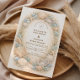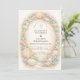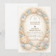 A refined coastal wedding design featuring an elegant oval wreath of seashells, oyster shells, starfish, and soft sea glass accents. Neutral sandy tones blend with muted ocean blues and delicate dune grasses to create a serene seaside aesthetic. The warm parchment background enhances the natural textures while maintaining a timeless, elevated feel. Perfect for a romantic beach celebration with classic coastal charm.