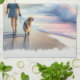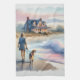 This dreamy coastal artwork captures a tranquil moment at the shoreline, where a woman strolls barefoot with her dog, the soft pastel tones of the setting sun casting a warm glow on the sand and sea. A charming beach house sits nestled among windswept grasses, its porch inviting and timeless, while a stately lighthouse watches over the horizon. Gentle waves roll in with watercolor softness, and hints of blush pink, misty blue, and sun-kissed gold give the scene an ethereal, nostalgic quality. The entire composition evokes slow living, serenity, and the quiet magic of coastal escapes. With a relaxed, coastal cottagecore vibe and a soft, painterly style, this piece blends warmth and whimsy in perfect harmony. AI generated artwork.