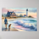 This dreamy coastal artwork captures a tranquil moment at the shoreline, where a woman strolls barefoot with her dog, the soft pastel tones of the setting sun casting a warm glow on the sand and sea. A charming beach house sits nestled among windswept grasses, its porch inviting and timeless, while a stately lighthouse watches over the horizon. Gentle waves roll in with watercolor softness, and hints of blush pink, misty blue, and sun-kissed gold give the scene an ethereal, nostalgic quality. The entire composition evokes slow living, serenity, and the quiet magic of coastal escapes. With a relaxed, coastal cottagecore vibe and a soft, painterly style, this piece blends warmth and whimsy in perfect harmony. AI generated artwork.