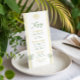 Bring breezy charm to your celebration with this coastal yellow stripes wedding menu featuring soft seashell touches and relaxed palm tree imagery. Perfect for couples planning a warm seaside celebration, this cheerful coastal look pairs beautifully with beach wedding styles and sunny outdoor venues, creating a light and inviting mood for your reception.