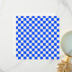 A blue and white checkerboard pattern with alternating squares fills the image, creating a geometric, balanced design with a classic, symmetrical feel.