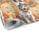 En vattenfärgsmålning stil av ett muntert sitta i hund i en hög av pulserande höst löv, omgiven av små pumpor och spridda hörn. Hund bär lite pilgrimhatt och beams med glädje, och fångade Thanksgivingens anda. I bakgrunden skapar mjuk skörd fält och träd med gyllene hud en fredlig landskapsambians. Struktur och varma, nedsmutsade hösttonar ge är en mysigt, nostalgisk perfekt för att fira säsongens skönhet.