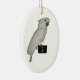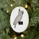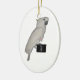 Ett foto av en söt vit cockatoo som pockar med en matskål på en prydnadsföremål