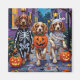 De berömvärda Cocker-spanjorerna som är klädda i lekfulla Halloween-kostymer bär pumpkiner medan de trillar eller behandlar under det månbelysta himmel. Denna festliga utformning belyser rasens långa öron, uttrycksfulla ögon och tillgiven personlighet, som perfekt fångar den uppsåtliga men trevliga stämningen från Halloween natt. Ett härligt firande för hundälskare och Halloween fläkt.